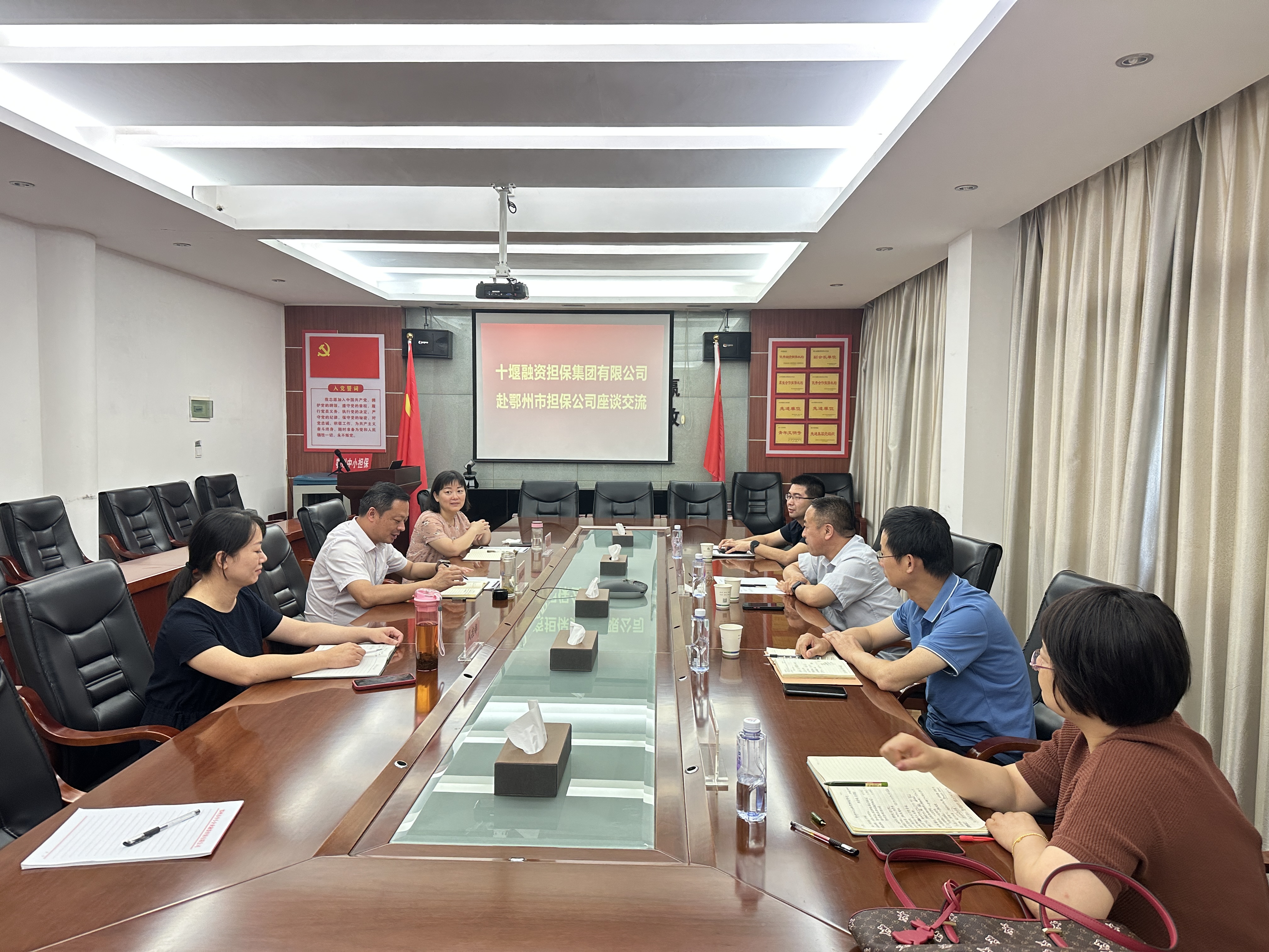 8月17日,十堰融資擔(dān)保集團(tuán)有限公司總經(jīng)理王少波、副總經(jīng)理?xiàng)钤湟恍械皆L鄂州擔(dān)保公司開展業(yè)務(wù)交流。鄂州擔(dān)保公司董事長(zhǎng)洪志雄、總經(jīng)理陳素娟及雙方相關(guān)部門負(fù)責(zé)人參加座談。